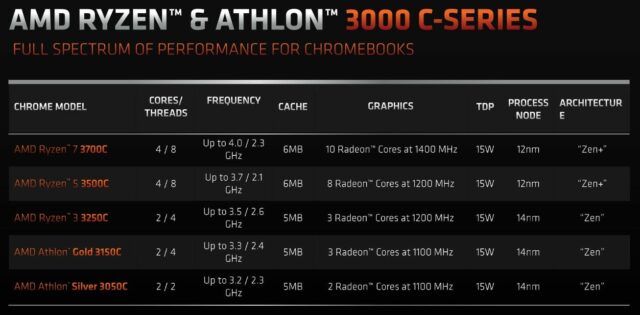 AMD offre tre processori Ryzen e due processori Athlon. I Ryzen 7 3700C e Ryzen 5 3500C (quattro core/otto thread) sono basati sull’architettura Zen+ a 12 nanometri. La CPU raggiunge frequenze massime di 4 e 3,7 GHz, mentre la GPU Radeon (10 e 8 core, rispettivamente) raggiunge una frequenza di 1,4 e 1,2 GHz. Il Ryzen 3 3250C (due core/quattro thread) è invece basato sull’architettura Zen a 14 nanometri. Per questo modello le frequenze massime per CPU e GPU (3 core) sono 3,5 e 1,2 GHz.