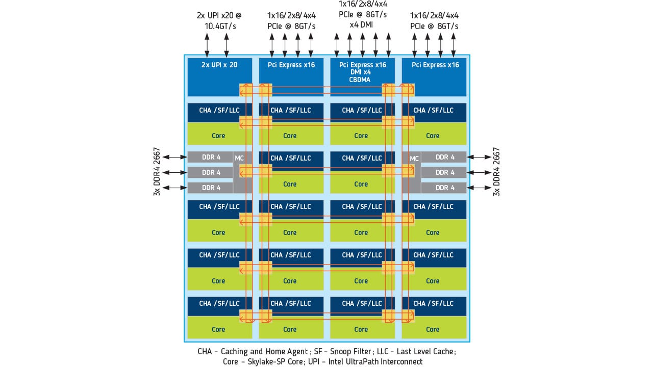 Skylake-X ha introdotto in ambito desktop la topologia mesh sviluppata per i prodotti Xeon Scalable Platform destinati al segmento enterprise e professionale. Questa soluzione collega tra loro tutti i core del processore all’interno di una griglia in modo da disporre di un maggior numero di percorsi e tragitti più brevi per mettere in comunicazione elementi fisicamente lontani tra loro all’interno dell’architettura. La struttura di tipo mesh migliora la latenza di comunicazione sia rispetto al caso peggiore, ovvero tra i core più distanti, sia rispetto alla media in quanto nella soluzione a griglia esistono più strade possibili e quindi una maggiore facilità per veicolare le informazioni.