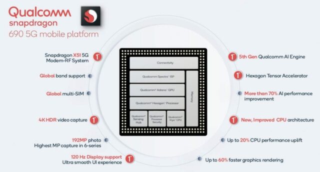 Il nuovo processore, realizzato a 8 nanometri, integra una CPU octa core Kryo 560 con frequenza massima di 2 GHz, una GPU Adreno 619L e un modem Snapdragon X51 5G che supporta le frequenze sub-6GHz e raggiunge una velocità massima in download di 2,5 Gbps e in upload di 660 Mbps. Lo Snapdragon 690 è il primo modello della serie 6 che supporta la registrazione video 4K HDR a 10 bit e schermi con refresh rate di 120 Hz.