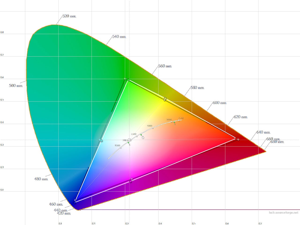 Il gamut del W1700 risulta ben centrato nel riferimento sRgb/Rec.709, ma il verde non può raggiungere il valore ideale. Buono il posizionamento degli altri colori.