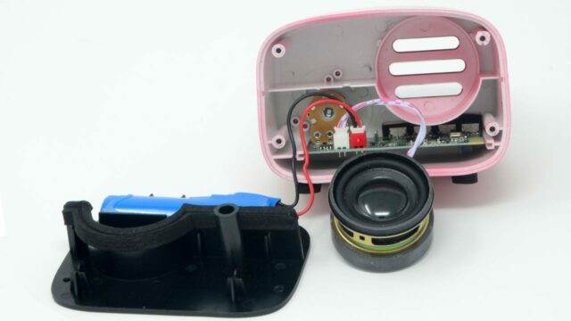 L’altoparlante è composto da un cono di 4 centimetri di diametro collegato a un grosso (in proporzione) magnete, con un diametro solo leggermente minore. L’assieme è robusto e di ottima fattura, due caratteristiche che contribuiscono alla buona resa sonora, come vedremo meglio tra poco. L’elettronica è montata su una basetta inserita alla base dell’apparecchio e alimenta lo speaker con una potenza di 5 watt. L’interno del corpo è diviso in due metà da una flangia sagomata dotata di una guarnizione gommata: sopra si trovano lo speaker e la batteria, incollata allo schienale posteriore, sotto l’elettronica e i comandi frontali. La parte superiore, isolata da quella inferiore, funge da cassa di risonanza secondo il classico schema della sospensione pneumatica e permette di migliorare la resa alle basse frequenze.