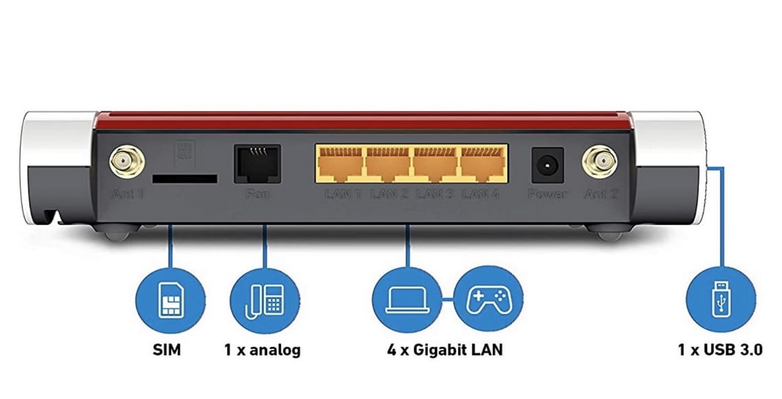 Tra i vari router della tedesca AVM per la connettività residenziale il Fritz!Box 6850 LTE si distingue per il fatto di avere un modem 4G integrato. Sul retro è presente uno slot per una Sim card, mentre manca una porta Wan o la classica porta per il collegamento del doppino telefonico.