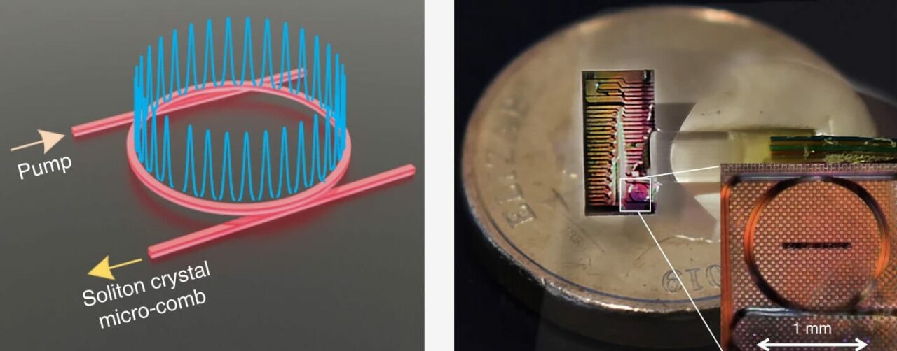 Alla base del risultato da 44,2 Tbps c’è l’impiego di un nuovo chip per il trasferimento dei dati, un dispositivo in configurazione “micro-pettine” in grado di simulare centinaia di laser infrarossi. Un singolo chip micro-comb ha sostituito 80 diversi laser, e ogni micro-laser ha funzionato da canale di comunicazione indipendente portando al record di trasferimento in oggetto.