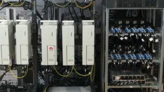 In alto, i cinque apparati di rete Huawei 4G, uno per ogni frequenza, usati in carrier aggregation per fornire una velocità di picco di 1,2 Gbps.