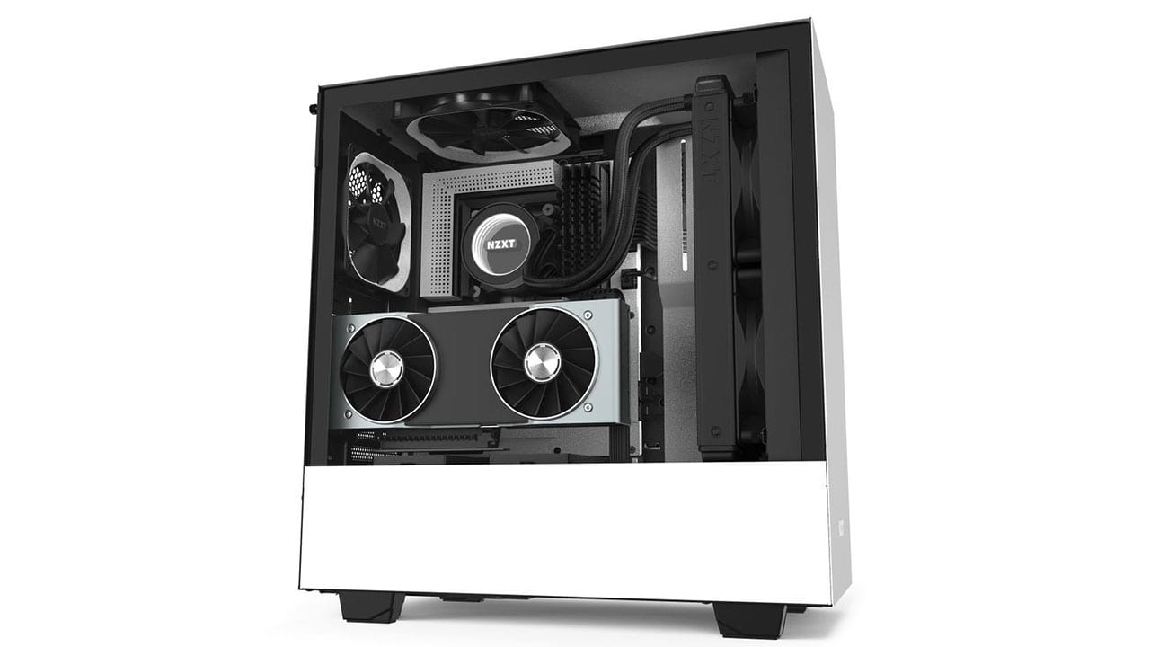 In questo caso PCSpecialist ha optato per un case NZXT H510 di tipo mid tower con colorazione bianca e finestra laterale trasparente in vetro. Questo telaio è un modello molto funzionale in quanto offre un’ampio spazio di manovra all’interno ed è progettato per semplificare i cablaggi interni. Il lato posteriore della piastra di ancoraggio della scheda madre è predisposto per fissare in modo ordinato i cavi di alimentazione, quelli per le ventole e l’illuminazione così come quelli per le porte di collegamento esterne.