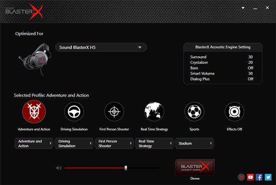 BlasterX Acoustic Engine Lite è scaricabile dal sito Creative. Offre cinque profili predefiniti, non personalizzabili, ottimizzati per i generi di videogiochi più comuni.