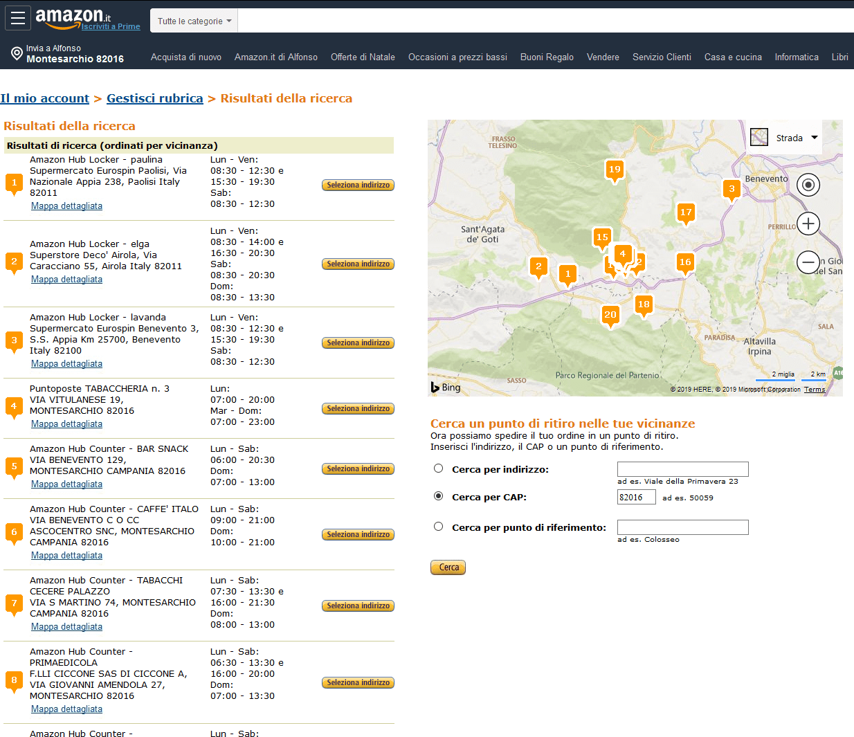 L’utente può individuare il punto di ritiro più vicino tramite l’apposita funzionalità di ricerca messa a disposizione da Amazon: specificando un indirizzo, un codice di avviamento postale o un punto di riferimento, il sistema visualizzerà un elenco dei Counter nelle vicinanze con tanto di mini-mappa con zoom (fornita da Microsoft Bing).