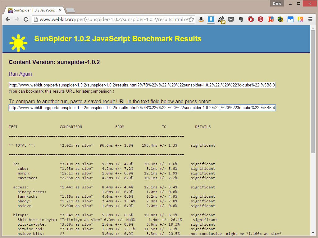 Il benchmark è raggiungibile da qui, e per avviarlo basta un clic sul collegamento Start Now!. Una volta completato il test, SunSpider restituisce un lungo indirizzo Url con tutti i risultati. Basta salvarlo come preferito, oppure copiarlo in un editor di testo, prima di modificare la configurazione del browser ed effettuare una nuova misurazione. Nella pagina dei risultati, infatti, è presente un campo in cui si può incollare l’indirizzo Url di un risultato precedente per effettuare un confronto immediato
