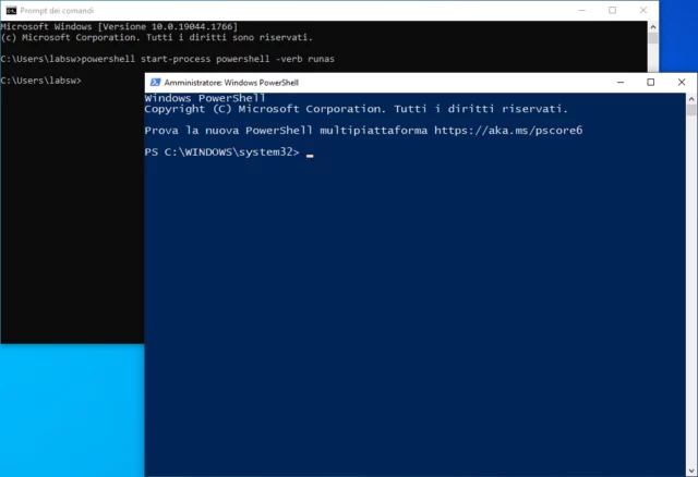Il comando start-process di Powershell viene invocato per avviare una nuova istanza dell’ambiente Powershell, con il parametro runas che consente specificare i privilegi di amministratore. In questo caso, l’ambiente Powershell verrà aperto in una nuova finestra, dopo aver mostrato la finestra di conferma del Controllo account utente.