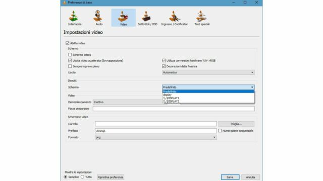 Avviate Vlc e aprite la finestra delle opzioni di configurazione selezionando Strumenti/Preferenze o sfruttando la scorciatoia da tastiera Ctrl+P e passate alla scheda Video. Nella sezione DirectX troverete la casella a discesa Schermo, per default configurata su Predefinito; richiamate il menu a discesa e selezionate invece il numero corrispondente allo schermo prescelto (figura 2), poi fate clic su Salva per memorizzare la nuova impostazione e chiudere la finestra.