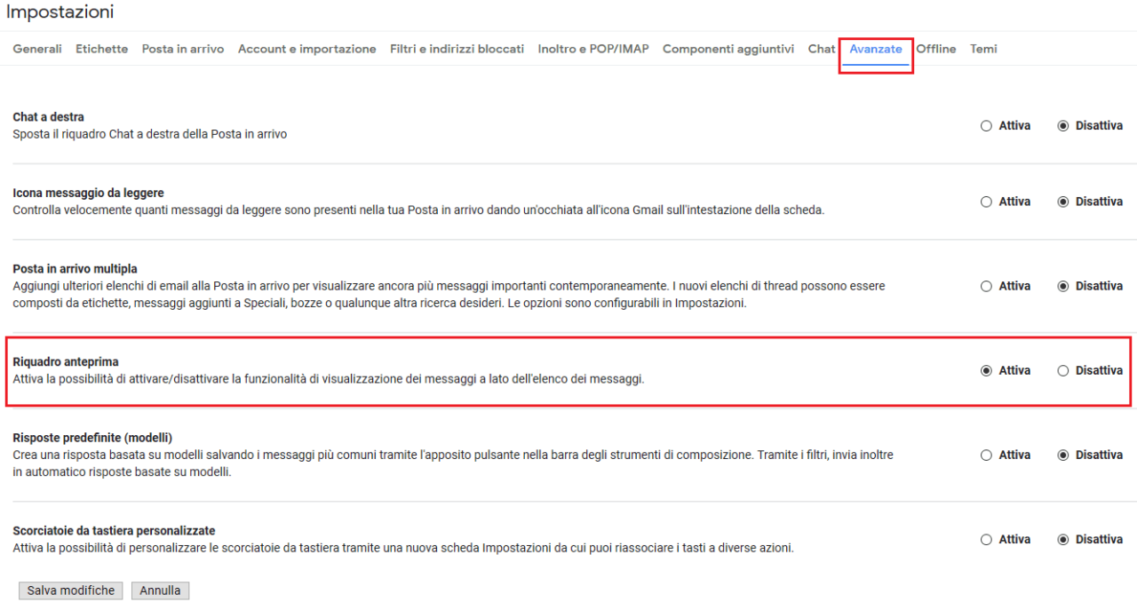 Tale anteprima è in realtà disponibile anche su Gmail in versione Web, e per abilitarla occorre accedere alle Impostazioni del servizio tramite l’icona-ingranaggio presente sulla destra della UI, selezionare la scheda Avanzate, quindi scorrere la lista delle opzioni disponibili fino alla voce Riquadro anteprima, selezionare Attiva, infine premere sul pulsante Salva modifiche.