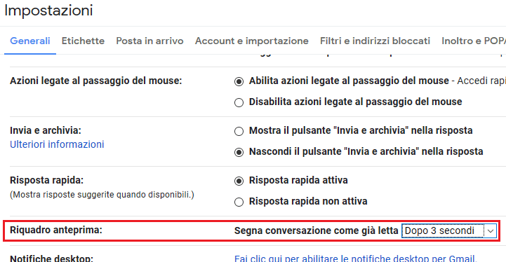 Una volta abilitata l’anteprima, tra le impostazioni Generali accessibili dall’icona-ingranaggio Gmail renderà disponibile anche una nuova voce Riquadro anteprima: da qui sarà possibile selezionare i tempi di attesa prima che la Webmail marchi una conversazione come “già letta” passando da alcuni secondi a Immediatamente o anche Mai.