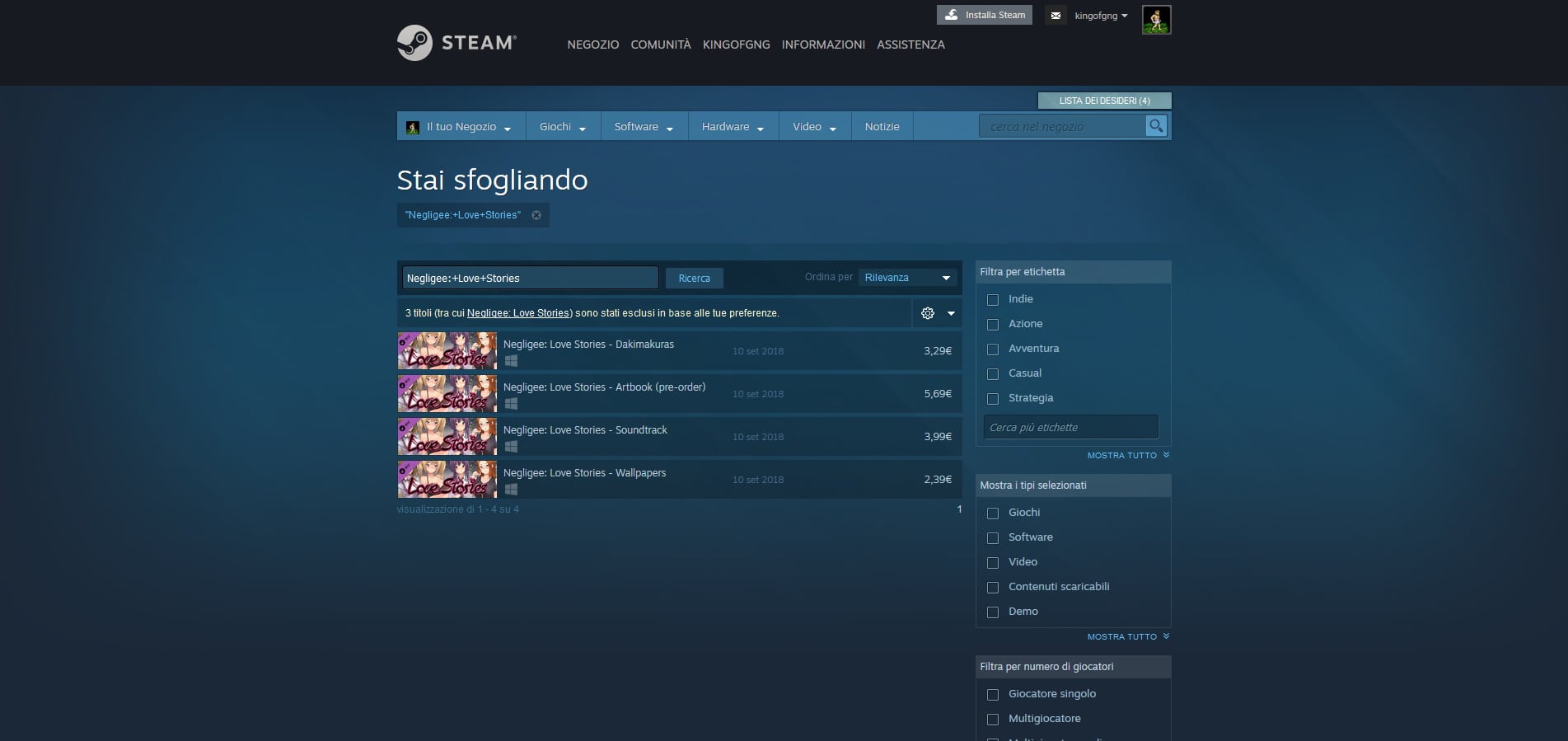 Per effettuare un test concreto sugli effetti delle nuove opzioni, possiamo provare a cercare Negligee: Love Stories sullo store di Steam: la visual novel di Dharker Studio è il primo gioco contenente nudi e scene di sesso (disegnato) esplicito senza censure ad approdare su Steam (anche se non in tutti i mercati), e se proviamo a cercare il titolo del gioco su Steam senza aver prima abilitato l’opzione “solo per adulti” ci troveremo davanti a risultati censurati. Una volta abilitata l’opzione nelle preferenze, invece, i risultati delle ricerche non avranno censura o “filtro” di sorta. L’accesso alla pagina del gioco sullo store tramite link diretto è sempre possibile con o senza filtri.