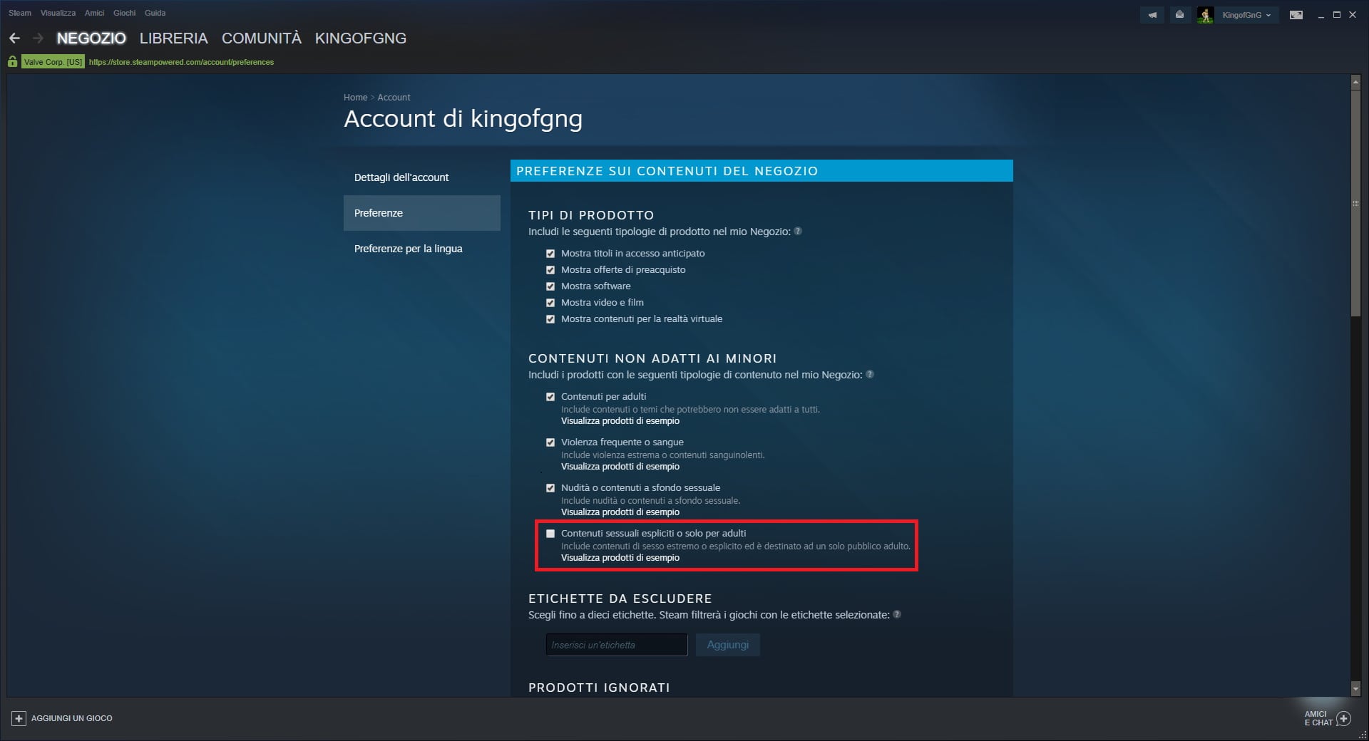 Prima di visionare il genere di contenuti in oggetto, gli utenti interessati dovranno in ogni caso modificare le impostazioni del servizio accedendo alle Preferenze del Negozio dall’icona del profilo sul client di Steam in alto a destra: l’opzione da abilitare è quella corrispondente alla casella Contenuti sessuali espliciti o solo per adulti, mentre con Visualizza prodotti di esempio è possibile avere un’anteprima dei contenuti che d’ora in poi potremo visionare sullo store. La nuova opzione avrà effetti immediati, ed è possibile abilitarla anche dalla pagina delle preferenze sul portale Web di Steam, mentre le altre preferenze disponibili ci permettono di impostare la visualizzazione di altri tipi di contenuti “non adatti ai minori”, di censurare o meno i contenuti violenti o a sfondo sessuale, limitare le preferenze a uno o più sistemi operativi e altro ancora.