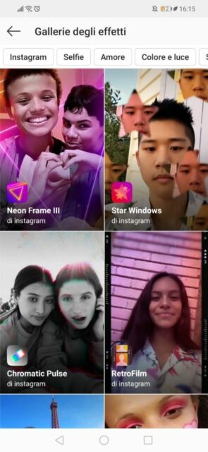 Nella schermata principale Instagram propone i filtri facciali creati dal social stesso, per mostrare agli utenti come funzionano.