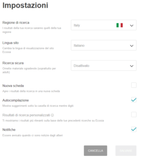 Ecosia trae i propri guadagni dall’advertising mostrato prima dei risultati delle ricerche, mentre in alto a destra è presente un contatore per il numero di ricerche già effettuate: in media, ogni 45 ricerche Ecosia pianterà un nuovo albero. Dal pulsante hamburger, accanto al contatore ad albero, è possibile raggiungere varie pagine informative e una pagina per personalizzare le ricerche in quanto a regione di pertinenza, lingua del sito, ricerca sicura o meno e altro ancora.