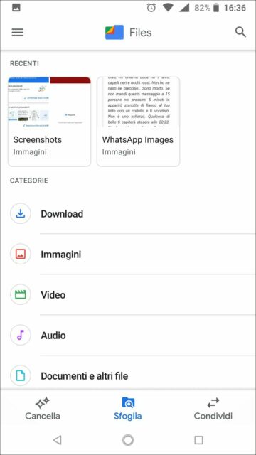 Per estrarre il contenuto di un archivio ZIP su uno smartphone o un tablet Android, occorre prima di tutto installare una app in grado di leggere il formato come Files by Google. Al primo avvio, Files offre una schermata multifunzione da cui è possibile liberare spazio sul terminale o effettuare altre operazioni avanzate. Nel nostro caso dovremo invece fare clic sul pulsante Sfoglia in basso per navigare tra i file attualmente presenti su disco.