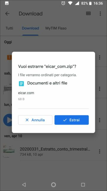 A questo punto Files ci chiederà se vogliamo estrarre il contenuto dell’archivio ZIP selezionato, indicandoci la categoria con cui i file verranno ordinati e permettendoci di confermare l’operazione con un tocco sul pulsante Estrai.