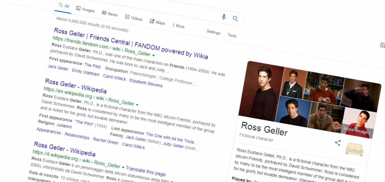 Il primo passo per attivare gli easter egg di Friends è quello di ricercare i nomi dei diversi personaggi nella barra di ricerca Google. Digitando quindi il nome di Ross Geller l’utente si troverà quindi davanti alla solita schermata, dove figurano i risultati più pertinenti alla ricerca effettuata.