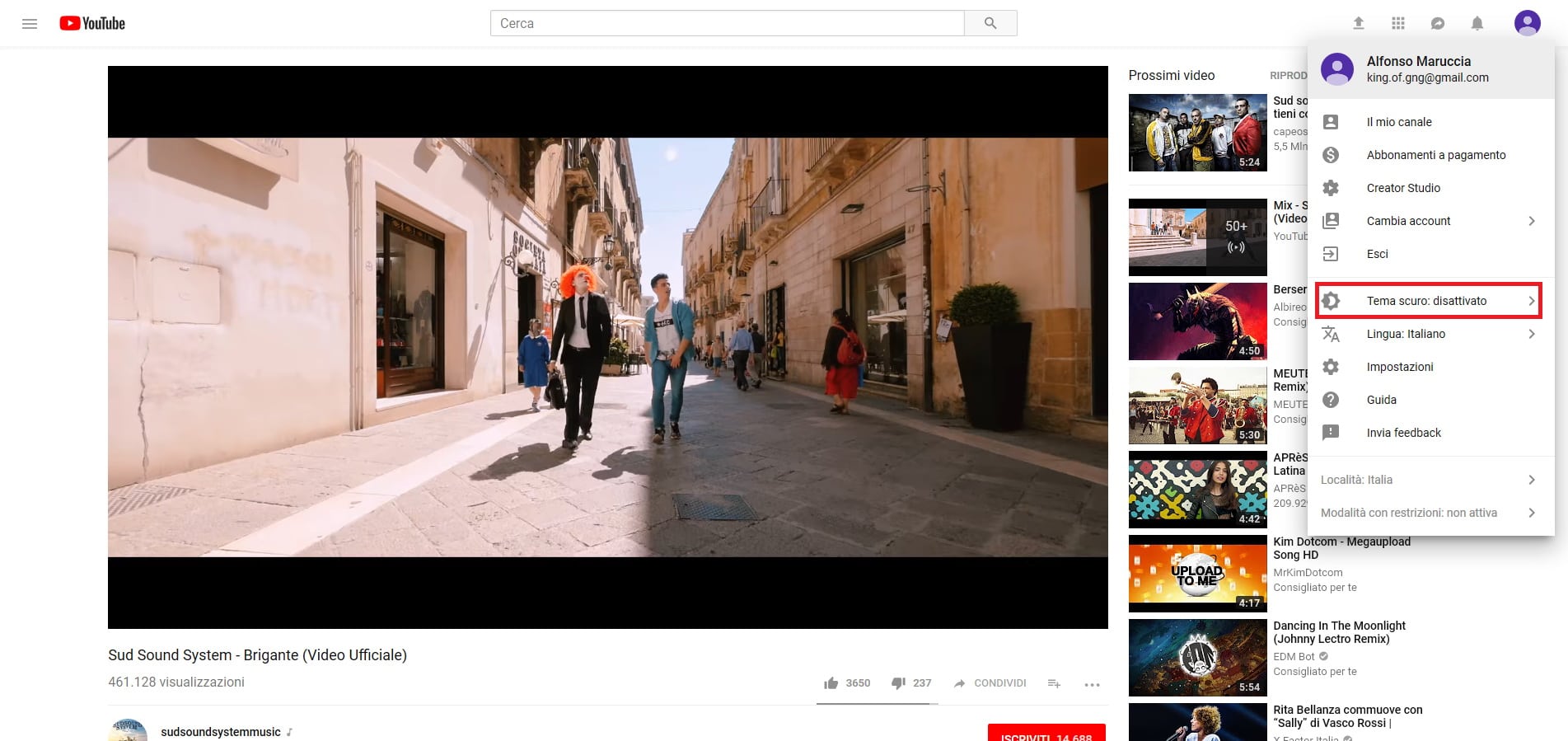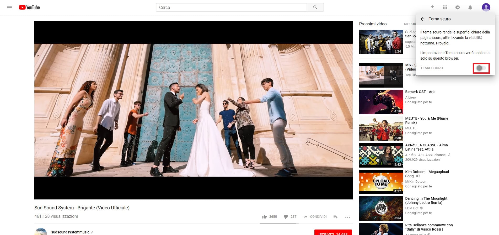 Per attivare il tema scuro sulla versione Web (desktop) di YouTube, occorre fare click sull’icona del nostro profilo utente disponibile in alto a destra sulla pagina del servizio, quindi fare click sull’opzione Tema scuro (che a questo punto risulterà ancora disattivata) e infine spostare lo slider TEMA SCURO verso destra per attivare il tutto. I risultati saranno visibili immediatamente.