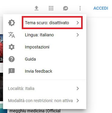 Se non si ha a disposizione un account YouTube o non si è collegati al suddetto account, l’opzione per il tema scuro è comunque accessibile facendo click sull’icona Menu (i tre pallini sulla destra accanto al comando ACCEDI) e avrà lo stesso risultato. Come indicato dal servizio, in ogni caso, l’impostazione “Tema scuro” viene applicata solo al browser in uso e non si sincronizza con l’account Google dell’utente.