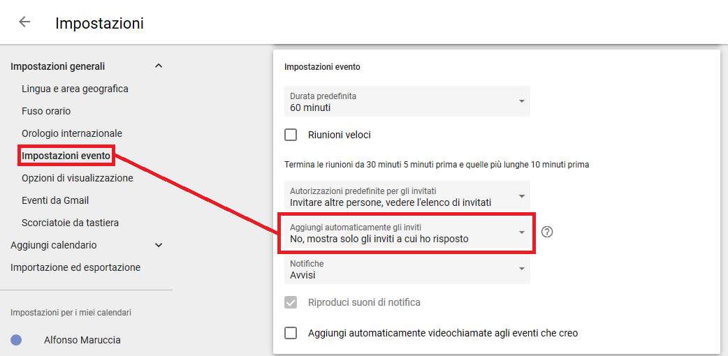 Per eliminare la possibilità di ricevere inviti indesiderati occorre andare sulle Impostazioni di Calendar (icona dell’ingranaggio in alto a destra), scegliere Impostazioni evento nel menu sulla sinistra e infine selezionare No, mostra solo gli inviti a cui ho risposto nelle opzioni disponibili per Aggiungi automaticamente gli Inviti.