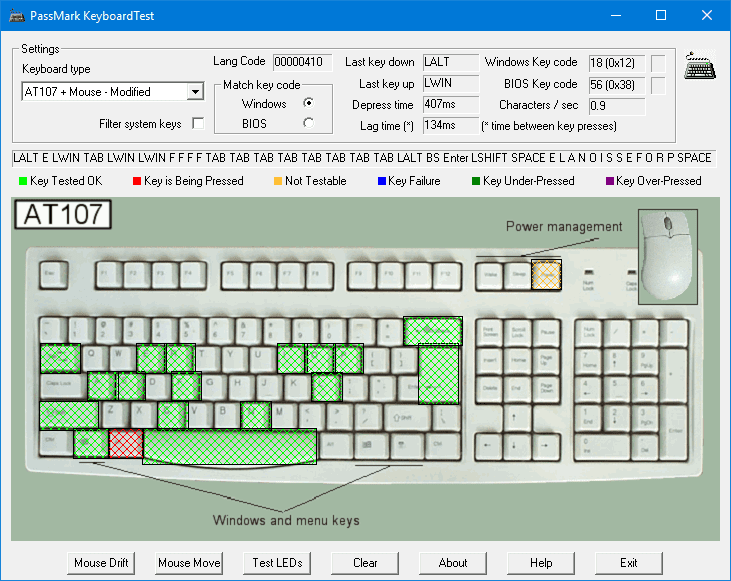 Dopo la pressione di ogni tasto sulla tastiera o sul mouse, o di una combinazione di tasti modificatori, PassMark KeyboardTest indicherà se l’interazione è andata a buon fine oppure c’è stato qualche problema e il tasto in oggetto non ha funzionato come avrebbe dovuto. Le informazioni diagnostiche fornite dal software includono il codice di ogni tasto (Windows e BIOS), il tempo di pressione, il lag e altro ancora.