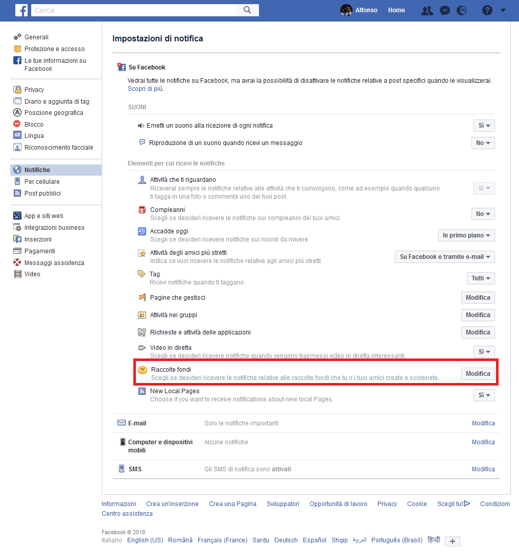 L’opzione che andremo a modificare si trova nella schermata delle impostazioni di Facebook, selezionando la scheda Notifiche sulla sinistra e infine scegliendo di modificare la pagina Su Facebook. La voce Raccolte fondi evidenziata nell’immagine in basto è il nostro obiettivo.