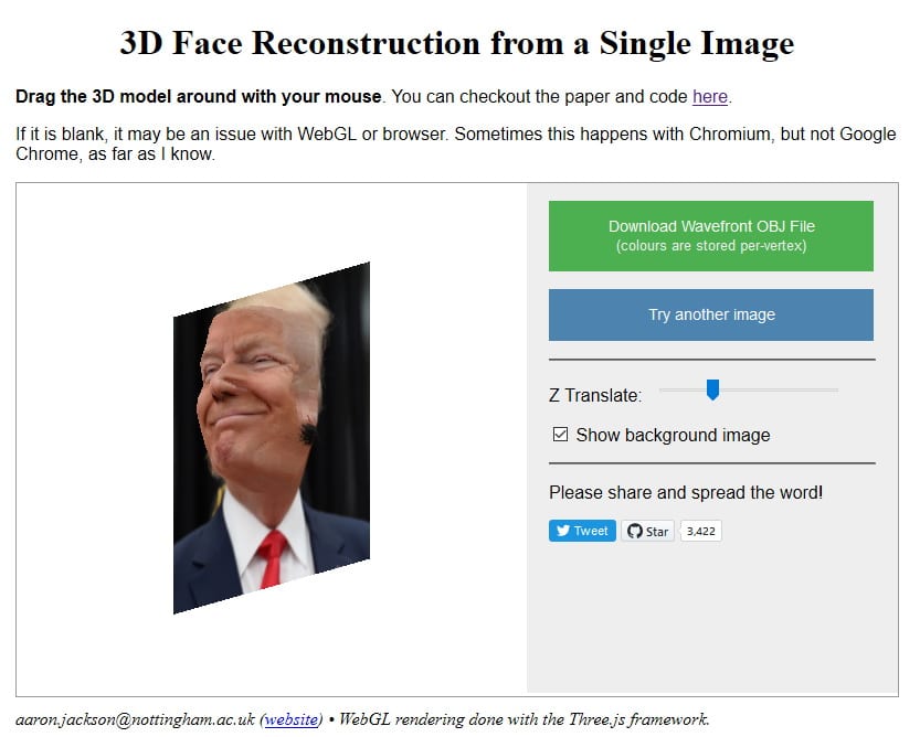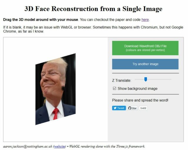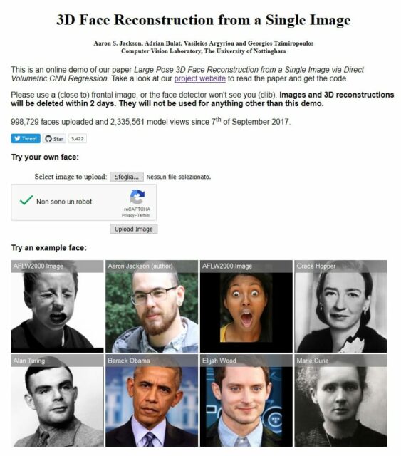 Il codice dell’algoritmo 3D – disponibile anche su GitHub per il download in locale – è utilizzabile visitando la suddetta pagina per la ricostruzione facciale tridimensionale: basta selezionare un’immagine presente sul disco locale, superare il box di reCAPTCHA, attendere qualche secondo e accedere alla pagina del risultato finale. Qui il volto 3D è manipolabile tenendo premuto il tasto sinistro sulla foto e muovendo il mouse nella direzione desiderata.