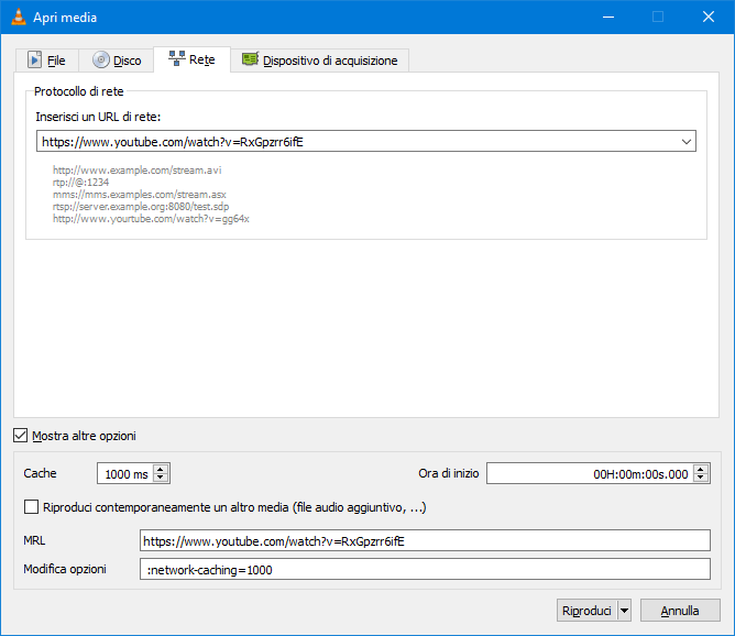 Per visualizzare un video di YouTube con VLC media player occorre selezionare Apri flusso di rete dal Menu Media del lettore multimediale oppure premere la scorciatoia da tastiera Ctrl+N, specificare l’URL del video che vogliamo visionare nella finestra Apri media e infine premere il tasto Riproduci. Spuntando la casella Mostra altre opzioni sarà altresì possibile cambiare le dimensioni della cache, il punto di partenza del video, la riproduzione di un contenuto aggiuntivo (magari audio) e la modifica manuale di tutte le opzioni selezionate.