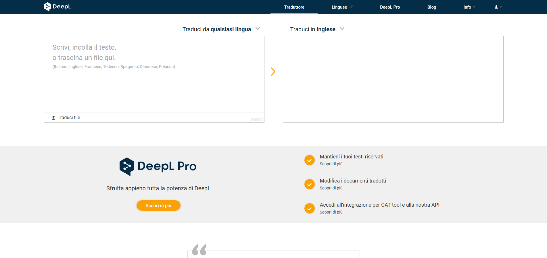 DeepL è un servizio di traduzione on-line disponibile in versione gratuita e a pagamento (Pro), una piattaforma che sostiene di “allenare” costantemente i suoi algoritmi a base di intelligenza artificiale per comprendere meglio i testi e quindi fornire traduzioni di maggiore qualità. Una caratteristica oramai comune a molti dei traduttori telematici, ma che nel caso di DeepL si sposa alla possibilità di tradurre un documento nella sua forma originale e salvare il risultato nella lingua desiderata.