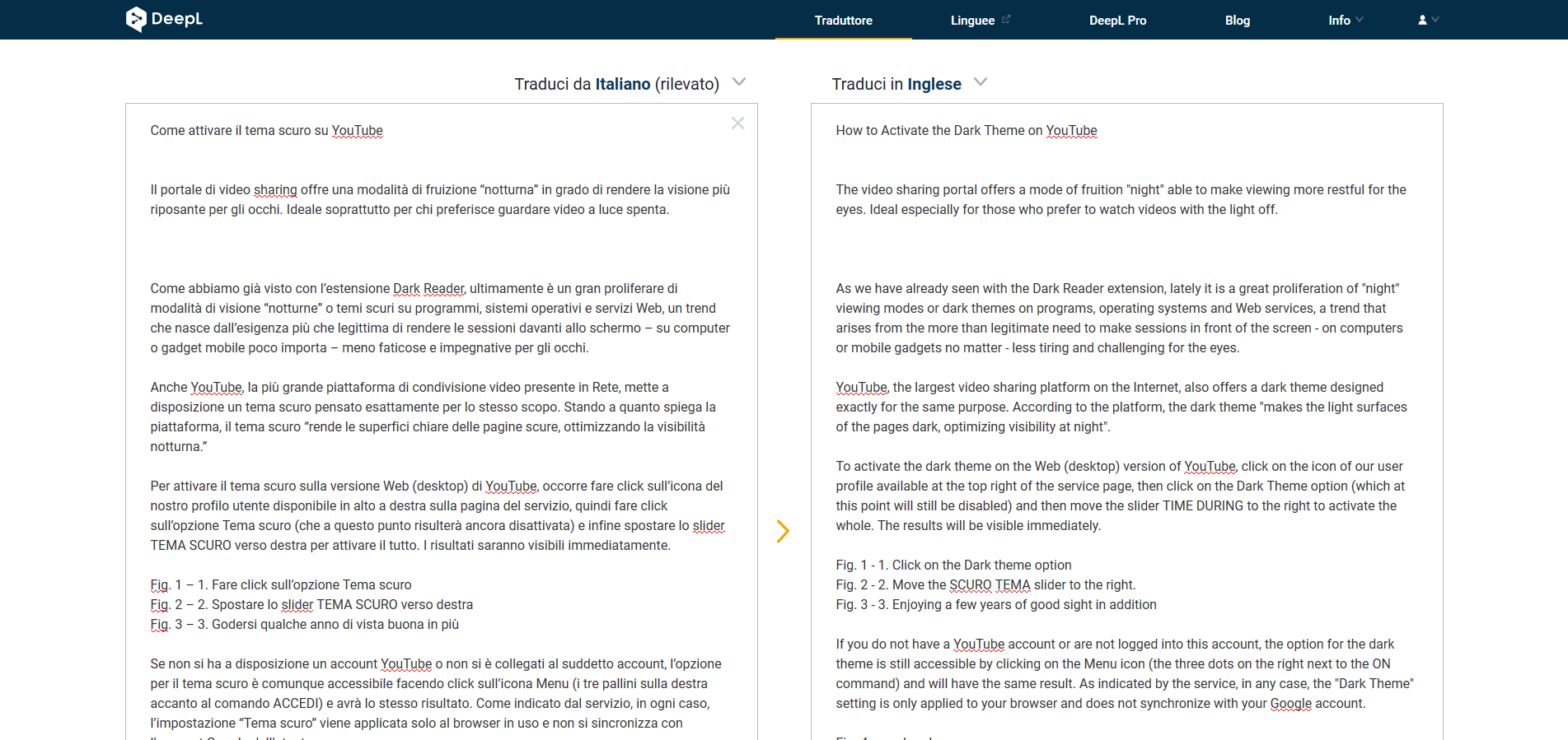 Traducendo dall’italiano all’inglese, il risultato degli algoritmi intelligenti di DeepL è oggettivamente molto buono – di sicuro in linea con quanto è possibile ottenere con i traduttori di Google e Microsoft. Anche con DeepL, insomma, siamo oramai lontani anni luce dalle prime traduzioni automatiche sputate fuori da robot spersonalizzati, e basta aggiustare la traduzione qua e là per avere un testo perfettamente comprensibile anche ai madrelingua.