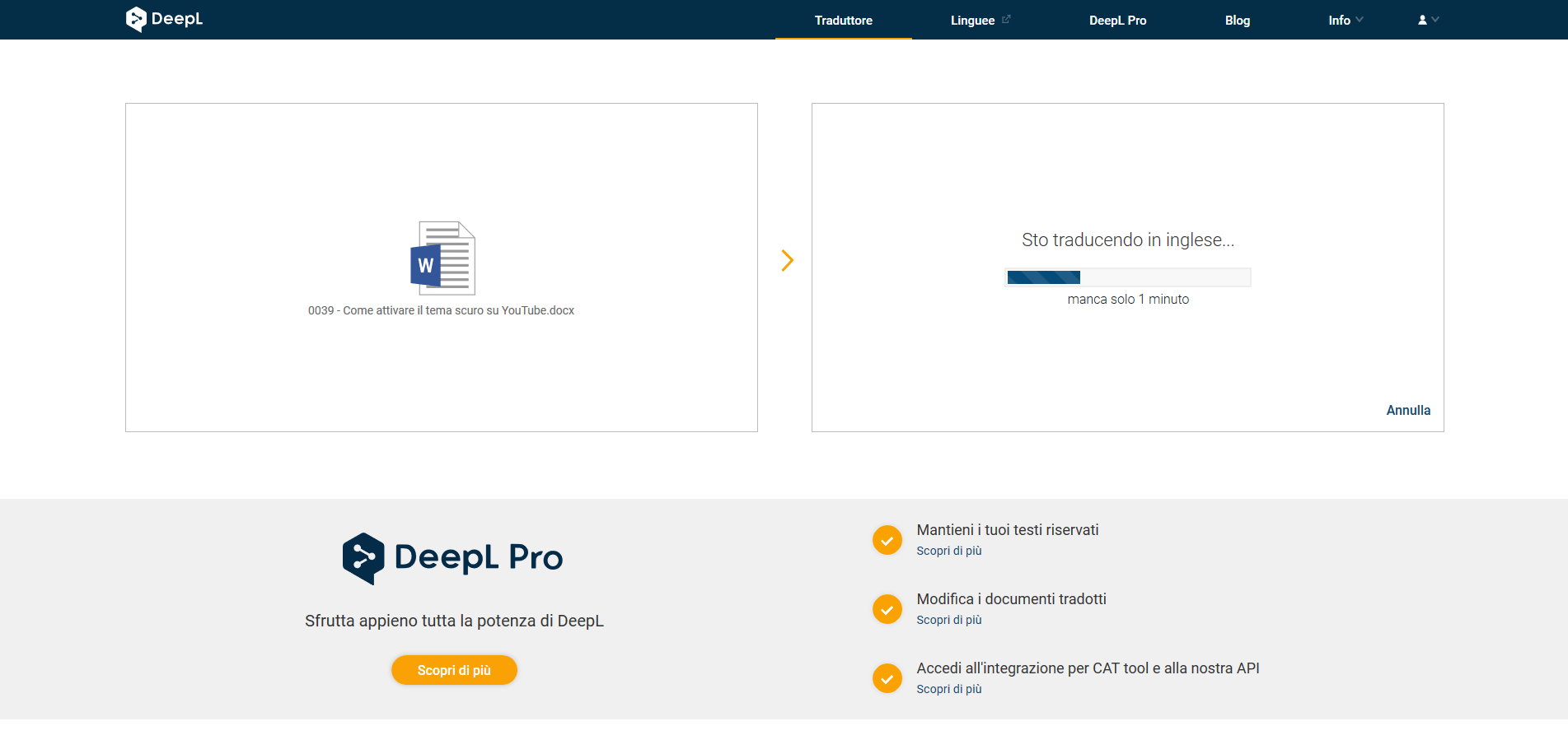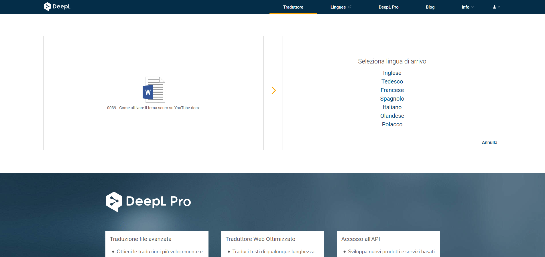 Una novità introdotta di recente da DeepL aggiunge la possibilità di tradurre i documenti nel loro formato originario: basta selezionare il file desiderato tramite l’opzione Traduci file presente nella parte bassa del form di immissione del testo (oppure trascinarlo col mouse dalla cartella locale sul form della pagina Web aperta nel browser), selezionare la lingua di arrivo nel riquadro sulla destra, aspettare qualche secondo per la traduzione e infine salvare il risultato sul PC locale.