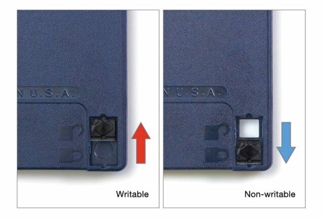 Anche in questo caso la tecnologia informatica dimostra di avere buonissima memoria, visto che un meccanismo praticamente identico è ancora oggi utilizzato per impostare la protezione da scrittura delle schede di memoria in standard Secure Digital. Spostando il “lock switch” di una SD Card (come quello indicato nell’immagine seguente) verso il basso, infatti, la scheda risulterà protetta dalla scrittura e sarà utilizzabile solo in modalità lettura. Spostando lo switch verso l’alto, la scheda tornerà accessibile anche in scrittura.