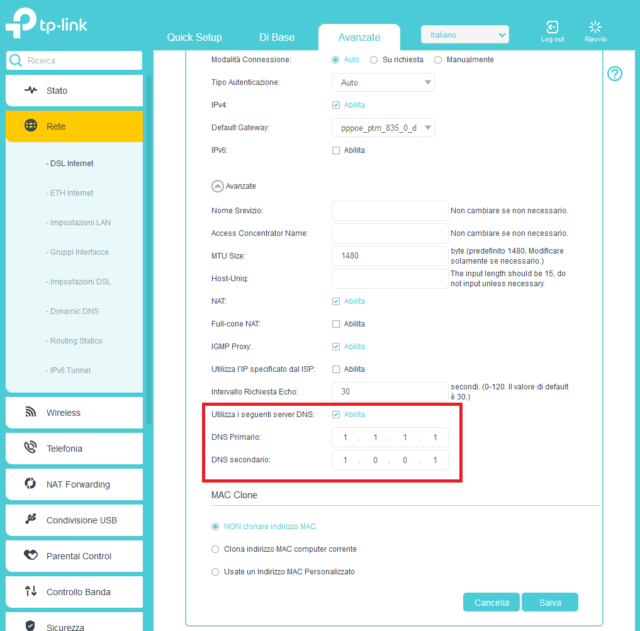 Per usare i nuovi server DNS occorre modificare le impostazioni corrispondenti nella configurazione di sistema, o meglio ancora modificare i server DNS usati dal router della nostra rete locale. Ogni router fa ovviamente storia a se, sul router domestico usato per i nostri test (TP-Link Archer VR1200v) i server DNS si possono modificare accedendo alle impostazioni Avanzate, quindi scegliendo Rete, DSL Internet, Avanzate, e infine Utilizza i seguenti server DNS.
