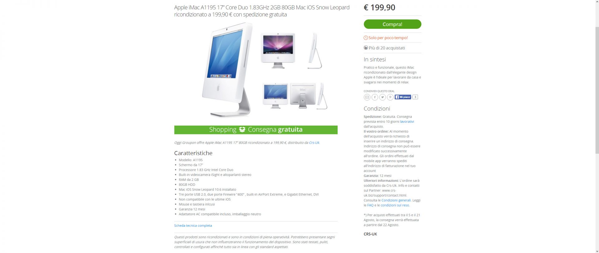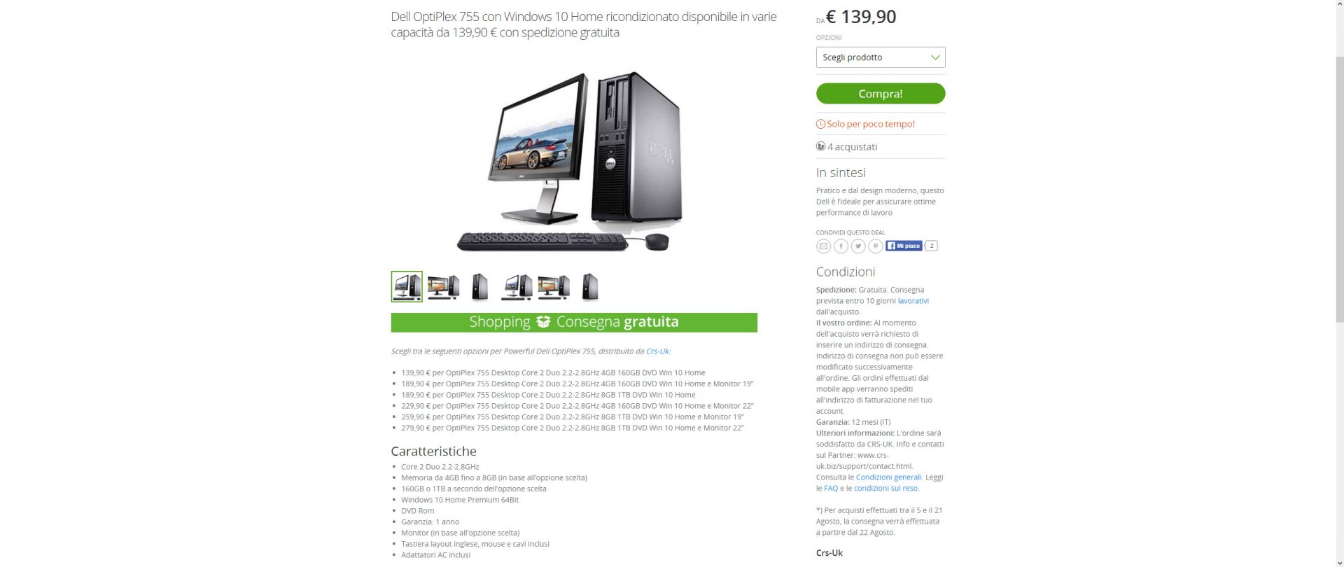 Online però è anche possibile trovare offerte (o presunte tali) su sistemi ricondizionati a un prezzo davvero stracciato: 139 euro per un desktop e 199 euro per un iMac all-in-one. Anche se vedete la scritta “Solo per poco tempo”, non abbiate fretta ad acquistarli. È vero che costano pochissimo, ma non valgono la spesa. Le due configurazioni che vi mostriamo qui sopra sono un esempio estremo: il desktop ha almeno 8 anni di vita alle spalle, mentre l’iMac addirittura 10. Anche se perfettamente funzionanti sono decisamente ormai obsoleti. Se poi guardate l’offerta più in dettaglio, vedrete che il venditore è inglese: quando acquistate la spedizione è gratuita, ma sappiate che, nel caso voleste renderlo, esercitando il vostro diritto di recesso, dovrete pagare una spedizione internazionale di reso. E nell’eventualità di guasti durante la garanzia? Anche in questo caso chi copre le spese di spedizione? Se davvero vi basta la potenza di calcolo di un computer “preistorico”, provate a chiedere ai vostri amici o conoscenti, sicuramente qualcuno di loro ha ancora, magari in qualche angolo della soffitta, un Pc perfettamente funzionante che non vede l’ora di regalare.
