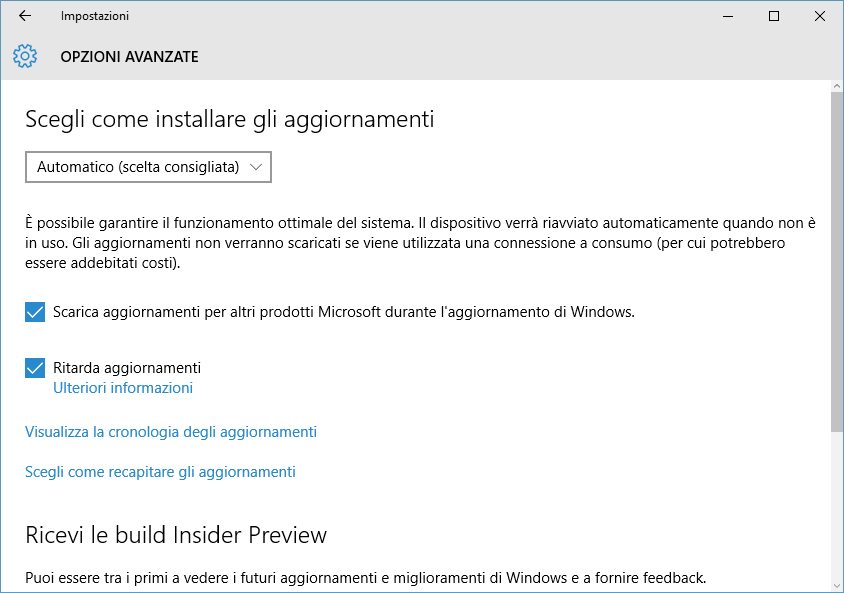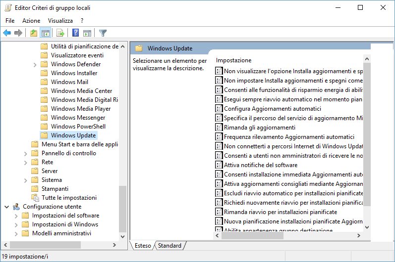 Dal primo update, inoltre, Microsoft offre anche Windows Update for Business, uno strumento che consente di ritardare l’applicazione degli aggiornamenti: anche se gli update non possono essere accettati o rifiutati singolarmente, ritardarne l’applicazione permette di limitare al minimo i rischi di applicare patch che possono minare la stabilità del sistema, o aggiornamenti che introducono nuove funzioni e modificano l’esperienza d’uso a cui si è abituati. Il controllo di queste funzioni avviene per mezzo dell’Editor delle policy di gruppo, ed è quindi riservato soltanto agli utenti delle versioni più avanzate di Windows (Pro ed Enterprise).
