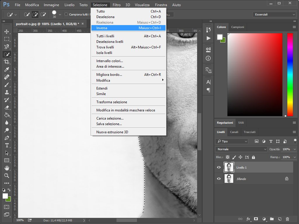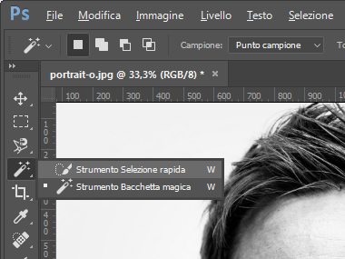 Una volta individuate le due immagini di partenza aprite Photoshop e caricate il ritratto. Duplicate lo sfondo su un nuovo livello con la scorciatoia da tastiera Ctrl+J (Figura A). Richiamate la Selezione rapida: è uno degli strumenti disponibili tramite il quarto pulsante della toolbar di sinistra; se non dovesse essere attivo, basta mantenere premuto il tasto sinistro del mouse sul pulsante per visualizzare l’elenco degli strumenti associati. Iniziate a selezionare lo sfondo facendo clic in una zona libera del ritratto, e continuate a muovere il puntatore del mouse fino a selezionare tutte le aree di sfondo (Figura B).