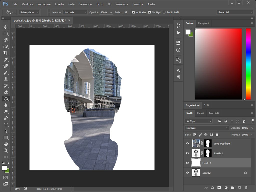 Aggiungete poi la seconda immagine, selezionando File/Inserisci incorporato. Se necessario modificatene le dimensioni per renderle simili a quella del ritratto, e poi confermate premendo il tasto Invio. Tenete premuto il tasto Ctrl e fate clic sull’icona della maschera appena creata per sovrapporre al panorama la silhouette del ritratto sotto forma di selezione. Se la posizione risulta convincente create una seconda maschera con il pulsante usato in precedenza, altrimenti spostate e ridimensionate il panorama fino a trovare la combinazione migliore.