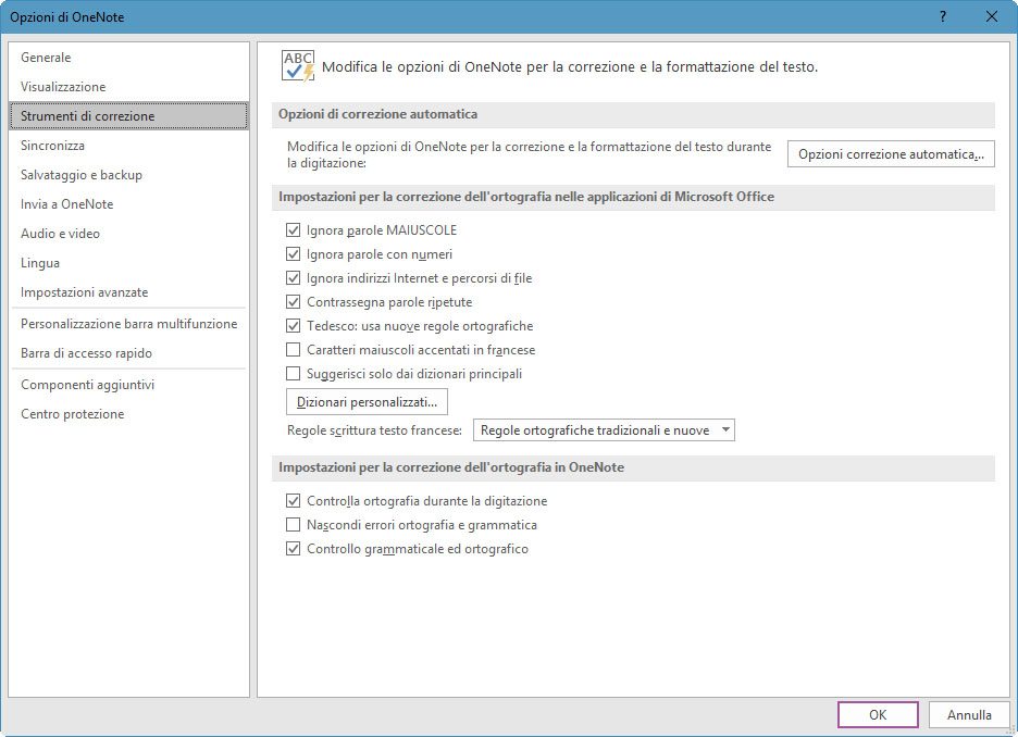 - Aprite la sezione Strumenti di correzione, nell’elenco di sinistra, e scorrete le opzioni fino a raggiungere il gruppo Impostazioni per la correzione dell’ortografia in OneNote.