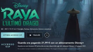 Disney Plus ha di recente scelto di inserire in accesso VIP la pellicola animata Raya e l’Ultimo Drago e prima anche il live action di Mulan. In questo modo, chi ha scelto di pagare la tariffa VIP, ha potuto vedere i film, prima che fossero disponibili a tutti gli utenti abbonati a Disney Plus. Per ottenere l‘accesso è necessario essere abbonati alla piattaforma streaming Disney+.