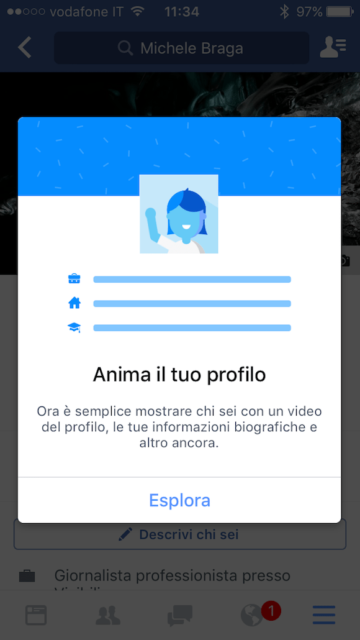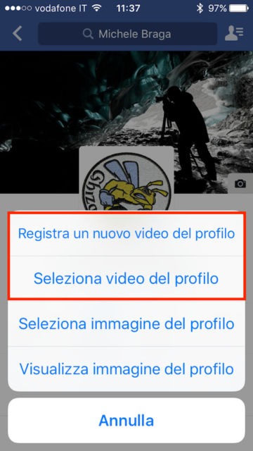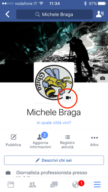 La prima cosa che dovete fare è andare sulla pagina del vostro profilo dall’app installata sullo smartphone (alcune opzioni non sono disponibili su computer o sull’app per tablet) e poi cliccare sull’icona che mostra la macchina fotografica o la videocamera e che compare nel riquadro delle vostra immagine del profilo (non quella della copertina del profilo). A questo punto potete scegliere se registrare un nuovo video oppure se caricare un video già presente nella galleria del vostro smartphone o in alternativa una Gif animata.