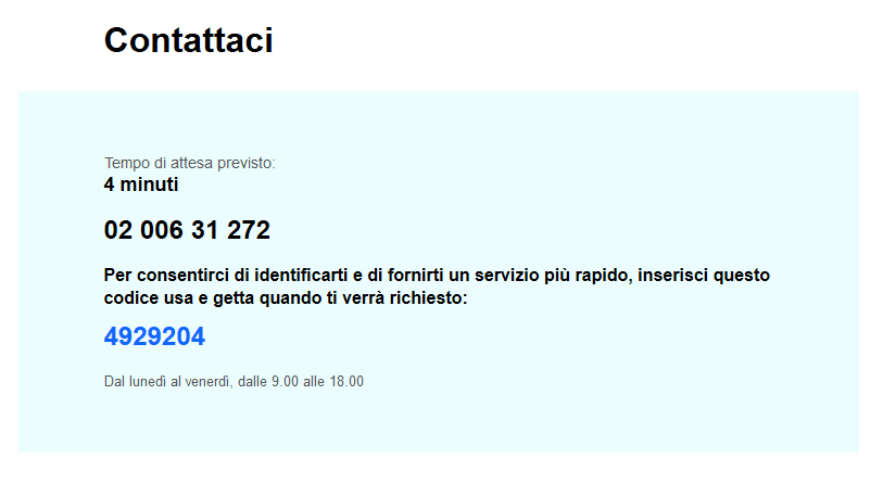 Sulla pagina “Contattaci” (accessibile solo passando dalla pagina indicata nel paragrafo precedente) viene indicato il numero telefonico da chiamare, ovvero 02/00631272, più un codice identificativo “usa e getta” che è possibile fornire al centralino automatico per velocizzare l’identificazione del nostro account eBay.