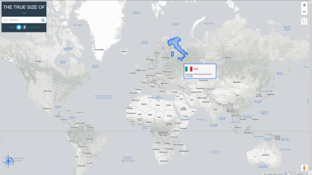 Un sito come The True Size Of offre un interessante occasione di apprendimento su un fenomeno particolare ma non molto conosciuto nel mainstream. La distorsione delle mappe geografiche ci accompagna quando usiamo Google Maps, quando viaggiamo o quando ci serviamo della geolocalizzazione per qualsivoglia motivo. Quindi tanto vale essere pienamente consapevoli della natura “virtuale” delle loro dimensioni.