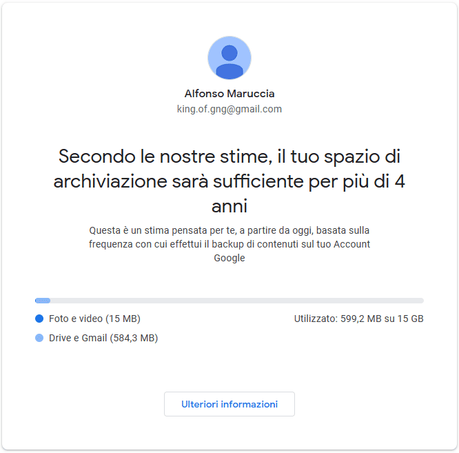 Il calcolo del tempo necessario a saturare lo spazio di storage è basato sull’attività individuale dell’utente, spiega Google, ovvero la frequenza con cui vengono effettuati il backup e il salvataggio dei dati sull’Account Google. Dal pulsante Ulteriori informazioni si accede poi a una spiegazione estesa sul modo in cui Google gestisce lo spazio di archiviazione e sulla nuova policy di Google Foto.
