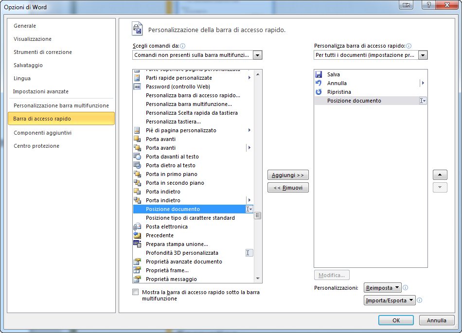 Fate clic sulla scheda File e poi su Opzioni nel menu di sinistra per aprire la finestra delle opzioni di Word (figura C). Aprite la sezione Barra di accesso rapido nella finestra di configurazione e selezionate la voce Comandi non presenti sulla barra multifunzione nella casella a discesa Scegli comandi da.
