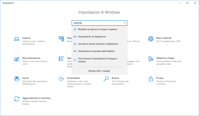 Qualora non fossimo soddisfatti dei risultati, potremo procedere a lanciare la app Impostazioni e quindi effettuare la ricerca direttamente all’interno della casella “Trova un’impostazione” presente in alto.