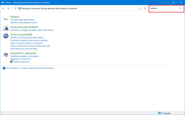 Anche il Pannello di Controllo, classica applicazionedi controllo del mondo Windows accessibile tramite una ricerca testuale dal solito Menu Start, offre la possibilità di cercare tra le impostazioni classiche tramite la casella in alto a destra.