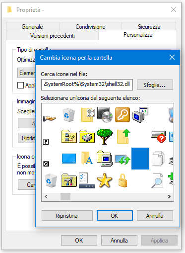 Ora sarà necessario cambiare l’icona alla cartella, selezionando Proprietà dal Menu Contestuale, la scheda Personalizza e quindi Cambia icona. Navigando tra le varie icone disponibili sarà facile identificarne una senza forma, selezionarla e confermare la scelta con il pulsante OK.