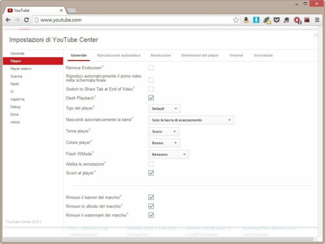 Innanzi tutto aprite la pagina delle estensioni e aggiungete un segno di spunta accanto all’opzione Modalità sviluppatore, in alto a destra. Scaricate l’estensione in formato Crx dall’indirizzo segnalato in precedenza e trascinate il file nella finestra di Chrome. Avviate infine l’installazione con un clic su Aggiungi, e attendete qualche istante. L’estensione si integra nell’interfaccia di YouTube; basta quindi aprire il portale per visualizzare la finestra di benvenuto. Per disabilitare il protocollo Bash, fate clic su Vai alle impostazioni, selezionate la sezione Player nell’elenco di sinistra e togliete il segno di spunta accanto all’opzione Dash Playback. Per richiamare le impostazioni di YouTube Center in qualsiasi momento, basta fare clic sul pulsante a forma di ruota dentata, aggiunto all’interfaccia di YouTube in alto a destra.